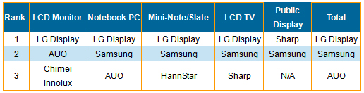 以營收來看,Samsung Electronics和LG Display是市場領先者,其市場占有率分別為26.0 % 和25.9%,總銷售金額為美金55億美元。AUO名列第三,營收金額為34億美元,市場占有率為16.1%。Chimei Innolux緊跟在后,市場占有率為14.0% (從2010年第二季的15.7%下滑),營收金額為30億美元。