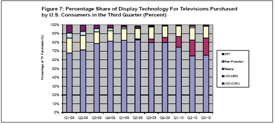 第三季度,大多數(shù)美國消費(fèi)者繼續(xù)購買老式的非LED型液晶電視,即CCFL電視。第三季度CCFL液晶電視占總體美國電視市場的份額從第二季度的64.6%升到65.3%,等離子、背投和CRT等其它顯示技術(shù)所占份額相應(yīng)下降。