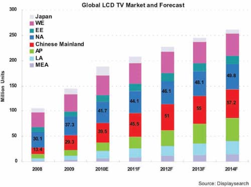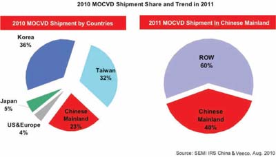2010年全球MOCVD新增安裝量中,由于受到LED背光在LCD TV滲透的加快帶動下, LCD TV制造強(qiáng)國的韓國增量最多,其次是臺灣地區(qū)。根據(jù)SEMI統(tǒng)計(jì),中國大陸今年MOCVD新增量大概在177臺,出貨量居全球第三。另外,根據(jù)SEMI統(tǒng)計(jì)和分析,結(jié)合MOCVD供應(yīng)情況,2011年中國MOCVD新增量份額有望達(dá)到全球的40%,而其它地區(qū)的增量會保持與2010年相當(dāng)?shù)乃交蛳陆怠?