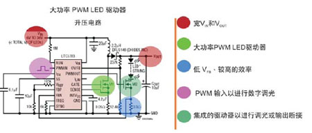 在高電流情況下驅(qū)動(dòng)LED要求有一個(gè)DC/DC控制器,以精確地調(diào)整電流,確保一致的光密度和顏色的統(tǒng)一性,并保護(hù)LED。此外,一個(gè)巨大的挑戰(zhàn)是利用電池電壓為一或幾串LED供電,電池電壓可以小于、等于或大于其負(fù)載電壓。另一個(gè)考慮是要有效地對(duì)大調(diào)光比率的LED進(jìn)行調(diào)光,同時(shí)維持其在低和高亮度水平上的色彩特性。此外,DC/DC驅(qū)動(dòng)器的有效運(yùn)行是一個(gè)關(guān)鍵因素,特別是在驅(qū)動(dòng)高亮度LED時(shí),因?yàn)樗袥]有用來照明的功率將成為熱損耗。