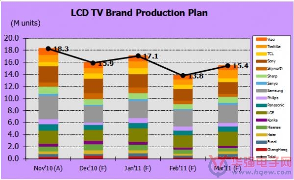 包括全球品牌三星和中國本土品牌康佳在內的前16家液晶電視品牌商每月生產總量已從2010年11月份的1千8百30萬臺降到了2011年3月份的1千5百40萬臺(如圖一)。同時,2011年第一季度生產總量預計為4千6百30萬臺,比2010年第四季度降低了12%。