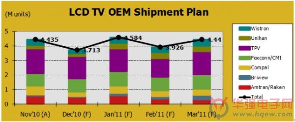 DisplaySearch顯示和電視研究總監Debroah Yang表示,“許多地區市場環境不穩定,從而導致電視需求量也不確定。盡管如此,第一季度的產品發布所預估的需求前景使一些品牌商增加了1月份的生產投入。”雖然電視品牌商對市場前景持謹慎態度,液晶電視代工廠商(OEM/ODM)卻在2010年12月份到2011年3月份期間持續增加每月出貨計劃。這個現象表明電視品牌商正在逐步增加生產外包到OEM/ODM廠商。而這主要是基于成本控管和生產規模的考慮。此外有些品牌商為了獲取所需的面板供應也會增加釋單比率。