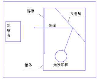 背投(RearProjector)的定義是相對于傳統的前投(FrontProjector)而言的。二者的主要區別在于圖像光線的來源方式。前投系統中,觀察者和投影機位于反射屏幕的同一側,投影機投射出的光線照射到屏幕后,再經過反射到達觀察者;而背投系統中,觀察者和投影機位于顯示屏幕的兩側,從投影機發出的光線照射到半透明的顯示屏幕上,部分透過后形成圖像,所以觀察者看到的是透射出來的光,其原理如圖1: