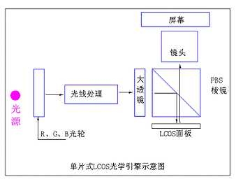 LCOS顯示面板其中一面以CMOS芯片為基板,無法讓光線直接穿過,因此采用穿透式成像方式,因此其背投光學系統和LCD背投影機便產生了區別。通常LCOS光學系統中需要利用偏極化分光鏡(PolarizationBeamSplitter:PBS),將入射LCOS面板的光線與反射的光線分開。PBS是由兩個45度等腰直角棱鏡底邊粘合的而成的棱鏡,當非線性偏極化光入射PBS時,PBS會反射入射光的S偏振光(垂直入射線平面),并且讓P偏振光(平行入射線平面)通過。關于LCOS光學系統技術仍在起步階段,所以IBM、ColorQuad、Philip、Hologram等多家廠商都開發了不同的LCOS光學引擎架構。但主要可分為單片式和三片式兩大類,如下: