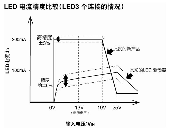 最近,汽車尾燈改裝LED燈的發展速度驚人,以低耗電量、長壽命這一優點為背景,今后也將日益推進汽車尾燈的LED化。此外,目前的LED尾燈是采用了10~20個LED發光二極管組成形式,但隨著LED的高亮度化和向普及型汽車的滲透, 減少LED發光二極管數量和其他器件用量的需求增高。在這樣的市場潮流中,即使是LED驅動器IC,對高精度化,高功率方面的需求也越來越高。因此,急需開發出車載尾燈用高性能LED驅動器。此次羅姆開發的尾燈專用LED驅動器IC, 因確保了200 mA的輸出電流,與以往的LED驅動器相比,輸出電流增加了3~5倍左右,從而使LED的高亮度化成為可能。另外,由于大幅改善了輸出電流精度,增大了LED誤差的容許范圍,尾燈組裝工序的成品率大幅改善。再有驅動方式采用了源驅動方式,驅動IC電路板與LED電路板的結線,與以往的同步驅動方式的2處相比,削減到1處后, 可以很容易實現車載用途所要求的開/短路檢測。再有,尾燈點燈時和剎車燈點燈時的亮度(電流量)可以自由設定的獨立電流設定等,在很大程度上方便了車載尾燈的設計。由P-BUS功能及LED開/短路檢測保護功能得以實現的故障安全功能也更加充實。