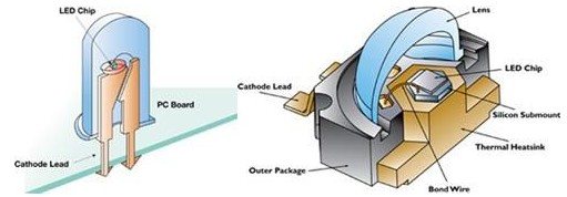 傳統(tǒng)炮彈型封裝,以插件式運(yùn)用,廣泛運(yùn)在家電或是通訊產(chǎn)品的指示燈,常看到的顏色多為紅、黃、綠色光等,但因?yàn)榇蟛糠諰ED產(chǎn)生的熱只能藉由2根導(dǎo)線,往組裝的基板上導(dǎo)熱,散熱效果不佳。