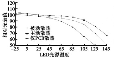 圖4是LED光源溫度與光衰在不同的散熱方式下的關系曲線。圖中可見僅PCB散熱、加散熱器的被動散熱和強制對流的主動散熱3種不同散熱設計存在相當大的差異。后二種在105℃時,基本上能夠提供80%以上的出光率。