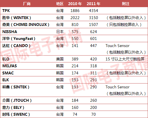 全球14大觸控屏廠家2010-2011年(預測)收入排名(單位:百萬美元)