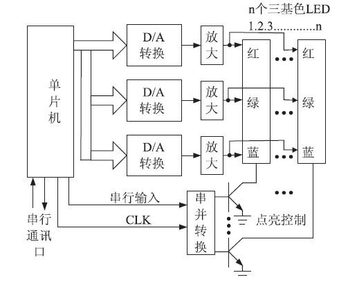 如圖2 中,87LPC762 單片機(jī)傳送數(shù)據(jù)到三路D /A 轉(zhuǎn)換器,將數(shù)字量轉(zhuǎn)換為模擬量,經(jīng)功率放大電路分別控制紅、綠、藍(lán)三色LED 發(fā)光的強(qiáng)度,從而控制LED 發(fā)光的顏色以及亮度, 對于多個(gè)LED采用動(dòng)態(tài)掃描的方式,由單片機(jī)控制兩個(gè)輸出端子以CLK 為基準(zhǔn)輸出串行信號,經(jīng)串并轉(zhuǎn)換器件控制處于開關(guān)工作的三極管分別對三基色LED 進(jìn)行點(diǎn)亮,完成對圖形圖案的控制。最后,此系統(tǒng)即可完成調(diào)光所需的各項(xiàng)功能。串行通訊接口采用RS232標(biāo)準(zhǔn)總線與計(jì)算機(jī)連接,可將計(jì)算機(jī)中需要顯示的圖案或文字傳送到本系統(tǒng)并顯示出來。