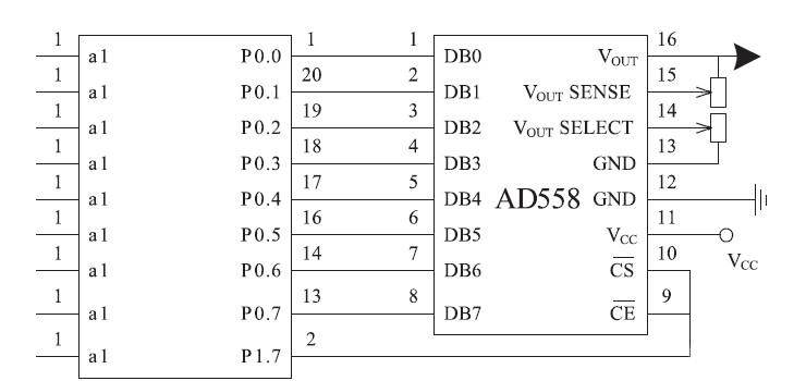 圖3 中AD558 是D /A 轉(zhuǎn)換芯片,能將數(shù)字量轉(zhuǎn)換為模擬量。單片機(jī)通過P0 口與AD558 的DB0 -DB7 連接,進(jìn)行并行數(shù)據(jù)傳輸,以此控制AD558 輸出電壓的高低,輸出電壓通過功率放大控制LED 單色發(fā)光的強(qiáng)度。由于AD558 是8 位的D /A 轉(zhuǎn)換芯片,因此通過三路D /A 分別控制三基色時(shí),其可將三基色中的紅、綠、藍(lán)分別分為28 = 256 份輸出,若將三基色任意組合即可最大形成2563 = 16777216 顏色和亮度的組合分辨率,通過軟件數(shù)據(jù)的設(shè)定可根據(jù)實(shí)際需要設(shè)置最大限度內(nèi)任意所需要的分辨率值。