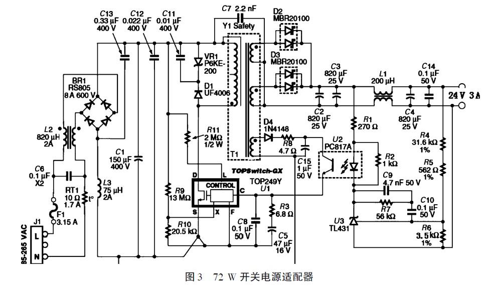TOP249Y在本電路中的直流電壓范圍為100~450V,一旦超出了該電壓范圍,TOP249Y將自動關閉。電阻R10使用20.5K電阻值從外部將流限值設定為僅略高于低電壓工作時的滿載峰值電流,從而允許使用更小的變壓器磁芯,同時避免啟動和輸出負載瞬態的磁芯飽和。VR1即瞬電壓抑制管,型號是P6KE200,電容C11與之并聯以降低齊納箝位的損耗。D1為阻斷二極管型號可選UF4006。目標鉗位電壓平均值約為180V.R4,R5,R6為輸出電壓的取樣電阻,取樣后與TL431的內部基準電壓進行比較,產生誤差電壓,再通過PC817A光耦反饋到控制引腳C,進而改變TOP249Y的輸出占空比,從而穩定輸出電壓。