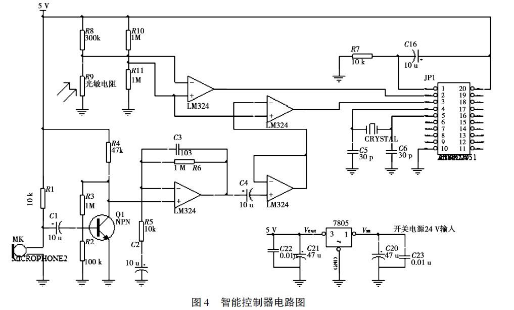 基于AT89C2051的智能控制器電路如圖4所示,其主要由傳感器單元、A/D轉換單元、控制器單元組成。AT89C2051芯片用于對來自聲控和光控傳感器檢測到的信號經過整形以后的信號數據做處理,進而控制LED驅動器。該電路中AT89C2051的p3.0和p3.1端口用作輸入信號檢測,剩下的13個端口可選擇輸出控制。軟件流程圖如圖5所示。