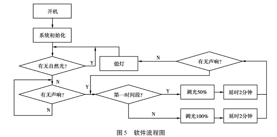 (2)當無光(自然光)時,若有人經過產生聲響,控制器先判斷時間段,若是在天色完全暗下來時(定義為第一時間段),則使LED發出100%亮度。其余時間段即天色還較亮,控制器可輸出50%占空比方波,使LED發出50%亮度即可,這樣可進一步節省電能,提高用電效率。