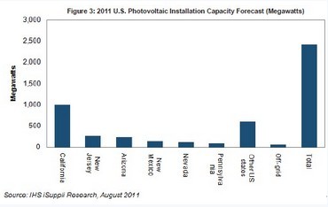 據(jù)IHS iSuppli公司的光伏市場(chǎng)研究報(bào)告,2011年美國(guó)光伏(PV)安裝容量將大增166%,總體安裝容量將達(dá)到2.4GW,加州將一馬當(dāng)先。
