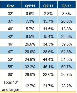 DisplaySearch指出,3D 面板優點隨熒幕尺寸增大更加明顯,因此3D液晶電視面板滲透率隨著尺寸越大而比重越高;3D液晶電視面板在40寸級以上的滲透率從第一季的12.7%成長到第二季的21.7%,電視面板廠商目標是在第三季達到28.2%的滲透率。