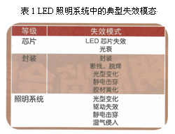 LED模組和燈具的典型失效模式包含了不同層次的失效模式,涉及到LED封裝結構以及工藝過程(如表1)。LED在實際使用中,由于復雜的環境以及封裝工藝局限性從而使封裝材料退化、熒光粉退化、金屬電遷移、局部溫度過高產生的熱應力所引起的芯片和硅膠的分層或金線斷裂等等,從而影響LED發光甚至導致整個LED的失效。而且LED產生的高溫會導致芯片的發光效率降低,光衰加快、色移等嚴重后果。