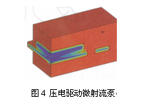 另一種主動冷卻系統是利用壓電驅動而產生脈動空氣,如圖4所示。該結構簡單,由一個PZT膜片和流動通道構成。該流動通道中設計者重點論述了出口和進口通道的設計。這種結構允許每一個振動周期中的流體在管道中的阻力和動力差別。