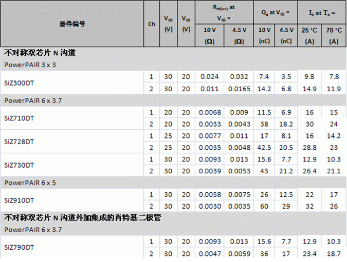 下表提供了所有五款新器件及SiZ710DT的詳細性能規格。