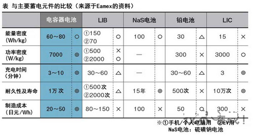 日本Eamex(總部:大阪府吹田市)開發出了采用導電性高分子膜的蓄電元件,不僅具備60.80Wh/kg的能量密度,而且功率密度達到了可在幾分鐘內完成充放電的7000W/kg(圖1)。功率密度超過雙電層電容器(EDLC),能量密度“與電動汽車(EV)使用的鋰離子充電電池(LIB)相當”(Eamex代表董事瀨和信吾)。如果能夠實用化,便有望實現能夠快速充放電的電池。而且充放電周期特性出色,該公司的評測結果顯示,反復充放電1萬次以上后,性能劣化較小,使用壽命較長(表)。