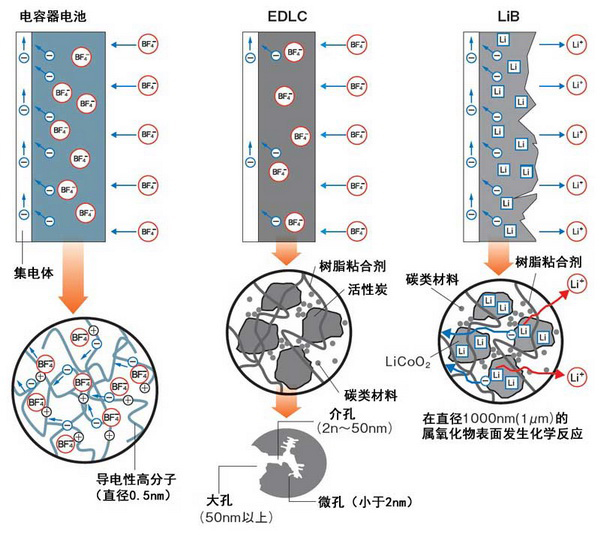 電容器電池正極的充放電原理與EDLC相似。充電時,電解液中的負離子BF4-被吸引到正極的導電性高分子膜,而放電時則由正極釋放出BF4-,并使其向負極移動(圖2)。與通過鋰金屬氧化物的化學反應來授受電子的LIB極為不同。而且負極與EDLC不同,通過讓正離子Li+進入負極材料夾層來進行電子交換。這一點與LIB或LIC相同。