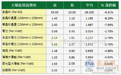 而在電池方面,最低價格仍來到每瓦0.43美元,平均價格則滑落到每瓦0.524美元,跌幅為2.78%;另外在模組方面,雖然矽晶太陽能模組的平均價格持續(xù)下滑到每瓦0.935美元,跌幅為4.88%;而薄膜部分也是下滑的狀況,平均價格來到0.856美元,跌幅為0.93%。