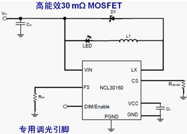 NCL30160是安森美半導體為驅動大功率LED推出的一款NFET遲滯降壓、恒流驅動器。它的電流提升到了1.5安培,損耗非常低,體積也更小,可最大限度地減少空間和成本。通過利用導通阻抗僅為55mΩ的內部MOSFET以及100%占空比工作的能力,能夠提供能效高達98%的方案。最高1.4MHz的高開關頻率使設計人員可采用更小的外部元件,將電路板尺寸減至最小及成本降至最低。