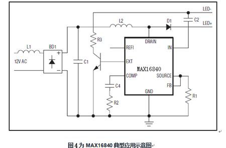 MAX16840具有的應(yīng)用特征是LED換代燈構(gòu)建技術(shù)的保證。MAX16840 集成MOSFET LED驅(qū)動(dòng)器,可用于MR16及其它12V交流輸入燈。它采用獨(dú)特的技術(shù)控制燈管的輸入電流,對(duì)輸入電流進(jìn)行整形,可使用大多數(shù)電子變壓器和調(diào)光器支持無(wú)閃爍工作,很好地解決了上述“問(wèn)題的提出”之困擾。