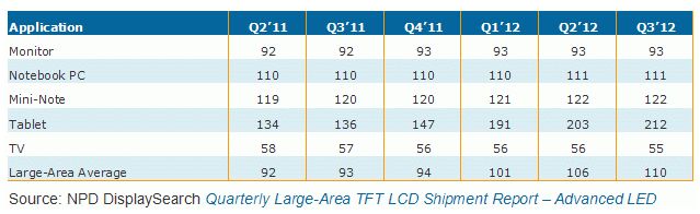 NPD DisplaySearch最新季度大尺寸TFT-LCD面板出貨調查指出兩個趨勢,一是平板電腦用面板持續往更高分辨率方向發展,二是低成本直下式LED背光面板將逐漸成為TFT-LCD電視面板另一主流。