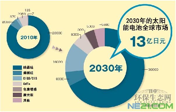 該調查的特點在于根據太陽能電池的不同種類進行預測。轉換效率及性價比較高的結晶硅太陽能電池到2030年將擴大到9萬億日元,約為2010年的3倍。約占整個市場的7成,依然是主流產品。