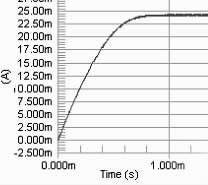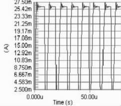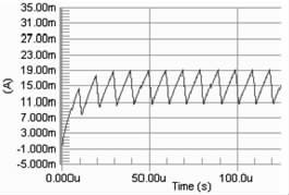 要保證PWM 周期小于電感的τ 時間, 因為若PWM 的周期大于τ, 則極有可能出現在PWM 的占空比變化的情況下, 電路中電流都能達到電感的飽和直流電流, 影響了對LED 電流調節。當C8051330 的時鐘頻率是25 MHz ,PWM 的周期的選擇對電流改變檔位的影響很大。若周期越大, 則PWM 占空比的檔位越多, 反之越少。擬用256 個檔位的占空比, 因此PWM 波的頻率應選擇在100kHz 以下,即周期在10 μs 以上,直流電感為10Ω, 此時電感值應選擇大于0.1 mH.圖2 分別是PWM 頻率為100kHz , 占空比為90%, 電感為0.1 mH、1 mH 和40 mH 時電路電流值的模擬結果。
