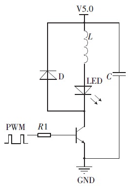 圖1 所示為驅動電路, 電感值的選擇以及PWM 波的頻率選擇在此驅動電路中相當重要。選擇C8051330 芯片作為PWM 波的輸出, 采用定時器翻轉控制高低電平的時間,從而控制PWM 波的占空比。