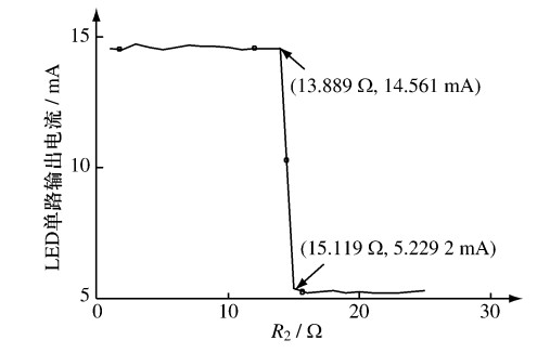為驗證輸出保護電路的功能,對電阻R2 進行參數掃描分析,之后進行性能分析。結果如圖3所示。可以看出,當R2 從1 Ω 增大到13. 889Ω時,輸出電流開始下降,表明此時單向晶閘管處于臨界導通狀態(tài);然后隨著R2 的繼續(xù)增大,輸出電流急劇下降,直至R2 為15. 119Ω時,輸出電流穩(wěn)定在5. 2 mA 左右,表明單向晶閘管已經完全導通,保護電路已經起作用。