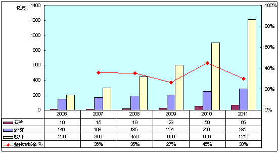 2011年,我國半導(dǎo)體照明產(chǎn)業(yè)規(guī)模達(dá)到1560億元,較2010年的1200億元增長30%。其中上游外延芯片、中游封裝、下游應(yīng)用的規(guī)模分別為65億元、285億元和1210億元,增速略有放緩。