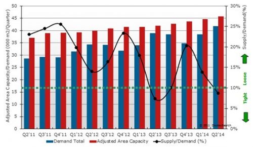 由于面板廠商在過去六個季度連續(xù)虧損,且產(chǎn)業(yè)處于不景氣階段且仍將維持一段時間,面板廠商凍結(jié)了所有液晶電視產(chǎn)線的擴張計劃。與此同時,面板價格下降,增加了市場需求,尤其是50寸及以上的大尺寸電視面板。因此NPD DisplaySearch預測特別是在2013年,面板供需平衡將較為緊張,供需過剩比將自2010年第二季度以來首度下降到10%以下。由此,NPD DisplaySearch預計平板產(chǎn)業(yè)將開始新的循環(huán)周期,面板價格將逐步上升,利潤得以提高,并促使投資增加。