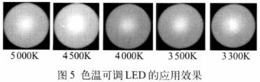 集成封裝的LED,由于工作電流較大,工作時產生大量的熱量,積聚在pn 結內部的熱如不及時傳導出去,將導致器件溫度升高,溫度對LED的性能產生重要的影響,如色溫變化、波長紅移、正向壓降等。圖5 所示為色溫可調LED的應用效果,將封裝好的色溫可調LED模塊安裝到100mm筒燈上,紅光LED加上不同的電流,得到筒燈的發光效果。筒燈連續點亮30min 后,測試筒燈上散熱器溫度為38℃,鋁基覆銅板上的溫度為38.5℃(室溫25.2℃),說明色溫可調LED 具有良好的散熱性能。