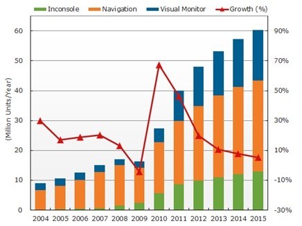 平板顯示器于車載的應用已經(jīng)越來越盛行,如汽車導航、多功能駕駛儀表盤、以及后座娛樂顯示屏幕等。NPD DisplaySearch預測應用于車載的面板出貨量將有望從2011年的4千2百萬片成長到2015年的6千2百萬片。