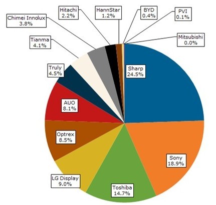 夏普、索尼、東芝等日本液晶顯示器制造商都專注于發(fā)展車用液晶顯示屏,不僅因為這些公司有能力產(chǎn)出高質(zhì)量的中小尺寸面板,也可以取得較高獲利空間。在車載應用上,夏普為領先廠商,擁有24.5%的市占率;索尼居次,為18.9%;東芝則有14.7%的市占率。