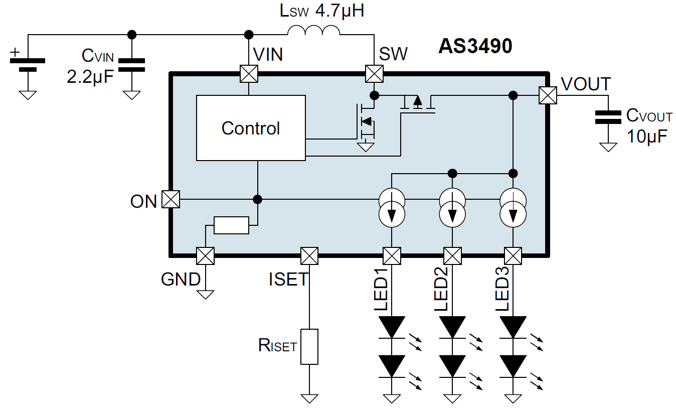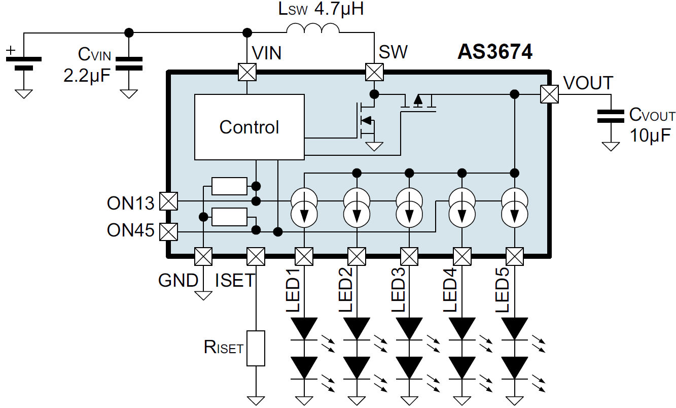 軟啟動的特點使AS3674更容易集成到對噪音敏感的無線射頻系統中。AS3674由兩組輸入電路控制,也可用介于100-800赫茲的PWM電路控制,實現1:2000的調光比。單通道兩個LED的配置結合2 MHz的轉換器操作頻率,實現使用諸如4.7µH電感的微小外部組件并取得優于競爭對手最高達6%的高效率。
