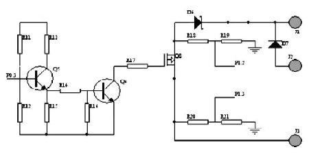 為了在夜間不同時刻采用不同的亮度,以達到節約電能的目的,本系統設計了兩路負載輸出,晚上12點以前兩盞LED皆亮,12點后一盞點亮,每路輸出均有立的控制和檢測。設計采用了PWM功率控制功能對LED燈具實現無級調光。單路原理如圖3所示。其中單片機P0.6 口給出控制信號, 即P 0 . 6 = 1 時, 三極管導通,繼電器閉合,MOS管導通,蓄電池向路燈供電。在電量不足或白天時,控制端輸出低電平信號,切斷供電回路。夜晚蓄電池電量不足情況下由市電供電系統給LED路燈供電,保證系統的完整和可靠。