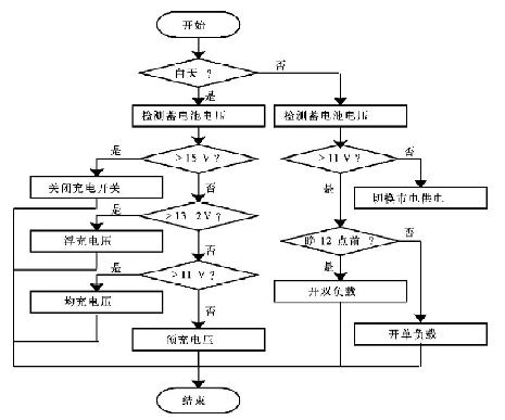 在放電過程中,首先保證在晚上12點前開通兩路負載,12點后開通一路負載,并且當蓄電池電壓低于保護電壓(11V)時,控制器自動切換到市電供電系統或關閉負載開關以保護蓄電池不受損壞。因此,充電管理和放電管理是系統軟件設計中的主要內容,充放電程序流程圖如圖4 所示: