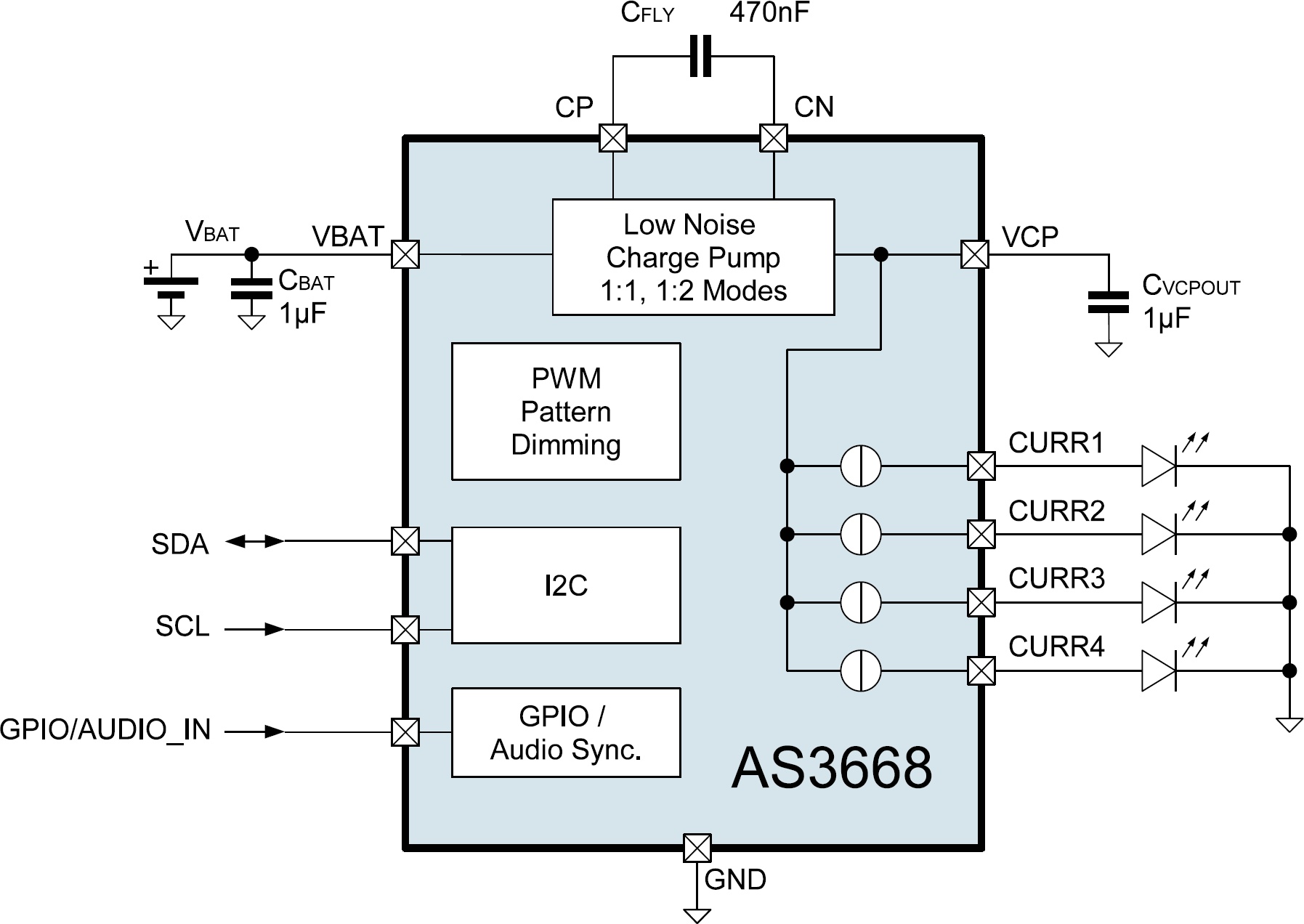 AS3668引人注目的燈光效果作為額外的用戶界面,可改善移動設備的外觀并帶來更高附加值。其12-bit PWM調光功能可實現諸如在高低不同亮度中無縫過渡的平滑呼吸燈效果。芯片同時擁有音頻同步模式,可根據音頻內容使LED改變亮度和顏色。