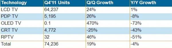 2011年第四季全球電視出貨量較去年同期下降4%,為7千420萬臺。液晶電視出貨量僅上升1%,為2004年以來最低;等離子電視下降了8%,CRT電視下降了43%。日本和西歐市場降幅最大,北美也僅維持少量增長,第四季度三個地區的電視總出貨量較去年同期下降了21%。新興市場電視出貨持續成長,增幅為12%,其中液晶電視出貨成長了20%。