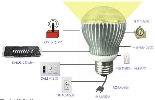 未來照明革新市場潛力巨大,如圖1所示。分時段控制是指在不同時間段有不同的亮度。環(huán)境亮度傳感器可以靈活應(yīng)對燈具所處環(huán)境的亮度,比如天陰的時候天黑的比平常早,那么路燈就會提前打開。動作傳感檢測器是指夜晚的時候如果燈具周圍無人活動時,會調(diào)低亮度,當(dāng)檢測到有人活動時,就會調(diào)高亮度。另外,現(xiàn)代照明需要有多重通信方式,除了無線方式以外,DALI或DMX512等先進的照明專用通信協(xié)議使得燈具的管理更加便捷,電力線載波通信(PLC)也是近年來備受關(guān)注的方向。