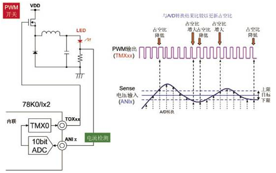 第二種是通過A/D轉(zhuǎn)換器進行反饋控制,使用A/D轉(zhuǎn)換器檢測LED電流,通過改變PWM輸出占空比實現(xiàn)恒流控制。通過改變A/D轉(zhuǎn)換的目標(biāo)值實現(xiàn)各通道的獨立調(diào)光,如圖3所示。