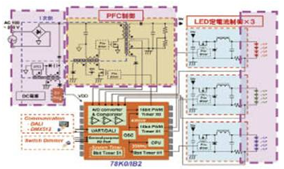 基于78K0/IB2 LED路燈方案如圖8所示。可實現(xiàn)AC220V,具有 PFC;驅(qū)動總功率60W;調(diào)光通信接口可采用RS485/PLC接口。