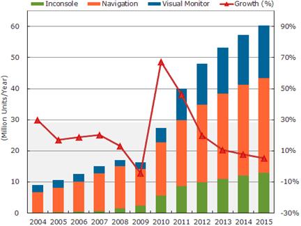 據(jù)NPD DisplaySearch– 平板顯示器于車載的應(yīng)用已經(jīng)越來越盛行,如汽車導(dǎo)航、多功能駕駛儀表盤、以及后座娛樂顯示屏幕等。NPD DisplaySearch預(yù)測應(yīng)用于車載的面板出貨量將有望從2011年的4千2百萬片成長到2015年的6千2百萬片。