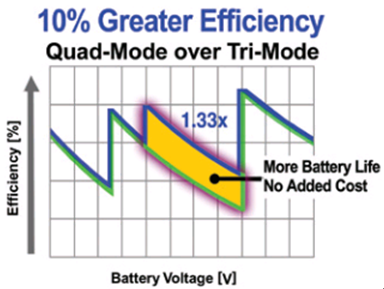 安森美半導體專利的四模(Quad-Mode®)自適應分數電荷泵的能效比市場上常規的三模電荷泵高出提供10%,并減小多達65%的封裝,將LED驅動器的性能提升到了新的水平。Quad-Mode LED驅動器通常可為基于電感的LED驅動器提供高能效,同時消除較厚的電感和有害的EMI干擾。
