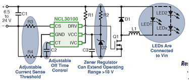 該驅(qū)動器控制器開關(guān)頻率高達700kHz,不需要輸出電容,Vcc工作范圍從6.35至18 V,可驅(qū)動一個或多個大功率LED,主要用在MR16 LED照明、環(huán)境燈照明、太陽能LED、交通照明、室外照明和LED光條等應(yīng)用。采用NCL30100的PCB非常小巧,可以裝入MR16燈的燈座內(nèi)。NCL30160的遲滯控制特性可在負載瞬期間提供快速的響應(yīng),無需小型信號控制環(huán)路補償元件。保護特性包括可利用電阻設(shè)定LED電流、LED短路保護、欠壓鎖定及熱關(guān)閉。