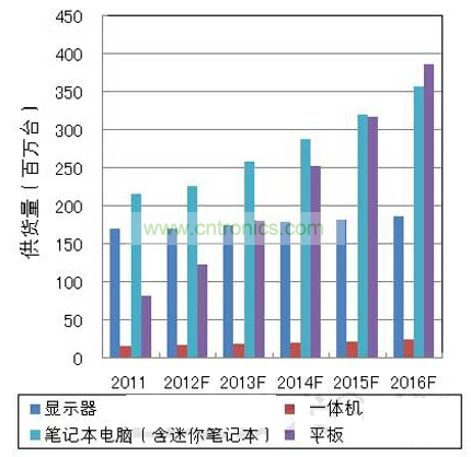 DisplaySearch根據所掌握的最新的面板生產動向和整機廠商的供貨計劃等資料,重新調整了2012年各類IT產品的供貨量預測。最新預測為,顯示器的供貨量將達到1.7億臺(比上年增加0.1%),筆記本電腦為2.25億臺(比上年增加4.8%,包含1700萬臺迷你筆記本電腦),一體型電腦為1600萬臺(比上年增加10.5%)。平板電腦方面,美國蘋果公司的“iPad”依然占據壟斷地位,預計2012年下半年,新產品將陸續登場,供貨量估計將達到1.22億臺(比上年增加49.2%)。