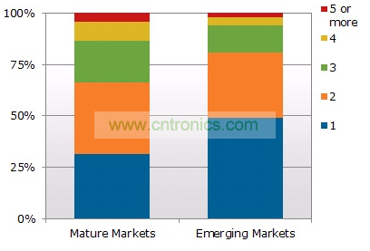 該報告還發現,在成熟市場家庭平均擁有2.4臺電視,而在新興市場平均每戶為1.8臺。成熟市場中,超過三分之二的家庭有一臺以上電視,但在新興市場近一半的家庭只有一臺電視。鑒于平板電視持續推出新機種、價格益加實惠、以及消費者對高品質、大屏幕和高清晰度電視的消費欲望,和成熟市場的消費者一樣,越來越多的新興市場消費者購買平板電視(主要是液晶電視)來汰換他們現有的舊款式電視。